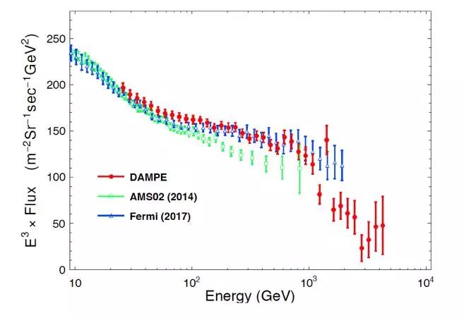 图为“悟空”卫星工作530天得到的高精度宇宙射线电子能谱(红色数据点),以及和美国费米卫星测量结果(蓝点)、丁肇中先生领导的阿尔法磁谱仪的测量结果(绿点)的比较。中科院供图聽