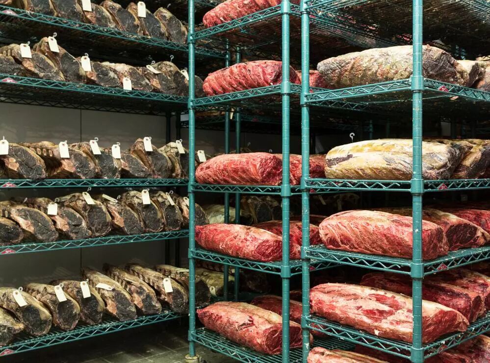 如果是牛肉,干熟成的过程会长达两个星期,牛的肥肉主要是饱和脂肪,不容易产生“酸败味”,也就是俗称的“哈喇味”,所以它可以放很长时间而不臭。