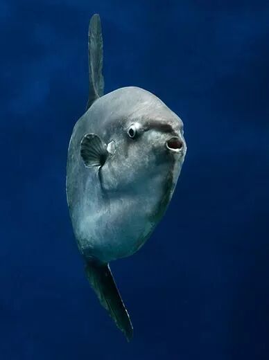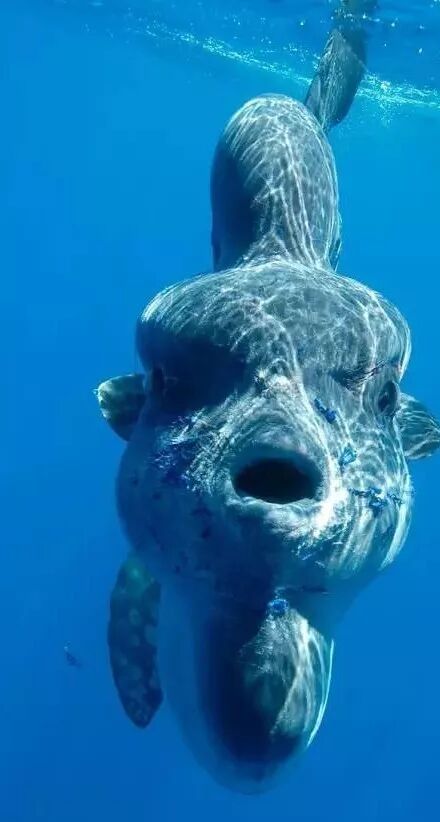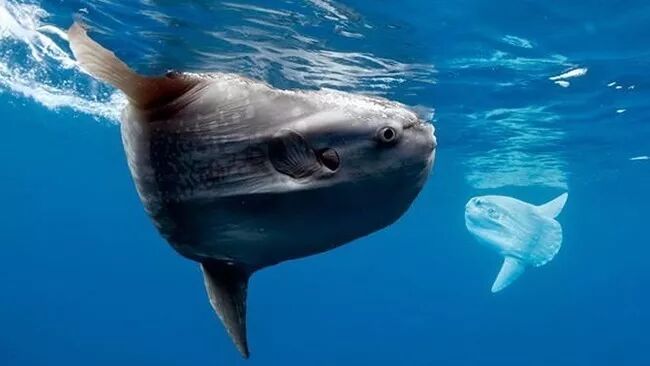 翻车鱼长得很怪,它的体型很大,但就长着半个身体,只有头,没有尾巴,背鳍和臀鳍如同张开的翅膀。