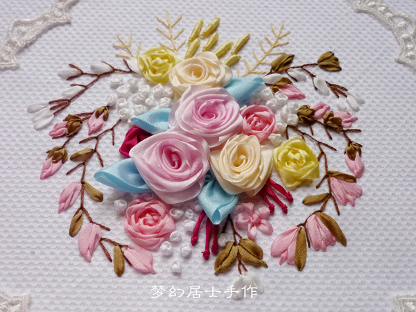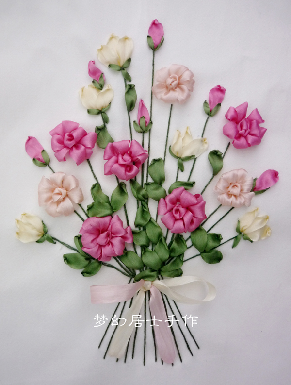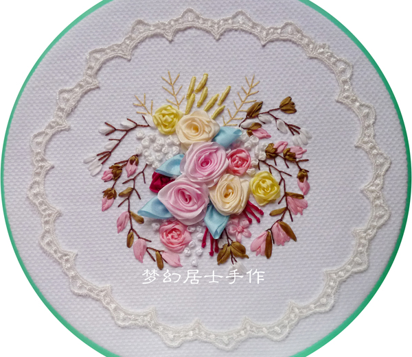 我一直坚信一副精致的手作作品来自于良好的设计,完美的色彩搭配,还要有最佳的材料,娴熟的技巧!所以我依然坚持选用品质上等的真丝丝带为材料,保持作品的完美性。从2002年接触真丝带绣起到如今,已坚持了13年之久,通过不断的摸索与总结,将西式的真丝带绣与中国水墨画元素融合在一起,逐渐形成自己独特的风格,到目前为止已出版过一本丝带绣书籍,第二本已交稿预计今年出版,现在与一家海外出版社签约编写一本英文版的丝带绣书籍。丝带绣的实用性非常广,可用于服装,家居用品,家居装饰,鞋帽,包包等上面