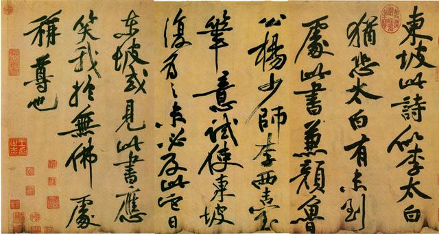 黄庭坚评价此帖说:“东坡此诗似李太白,犹恐太白有未到处。此书兼颜鲁公、杨少师、李西台笔意。试使东坡复为之,未必及此。”