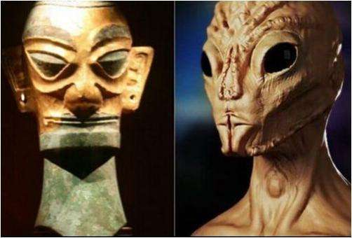 嗯,按照这个思路,我们来看看三星堆的文物,还真挺像的,尤其是这个青铜面具,简直跟美国科幻片里面的外星人度身定制的一样啊!