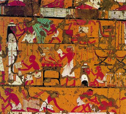 其实这种表现手法也不是中国人的首创,在古埃及壁画中,也有类似的画面。
