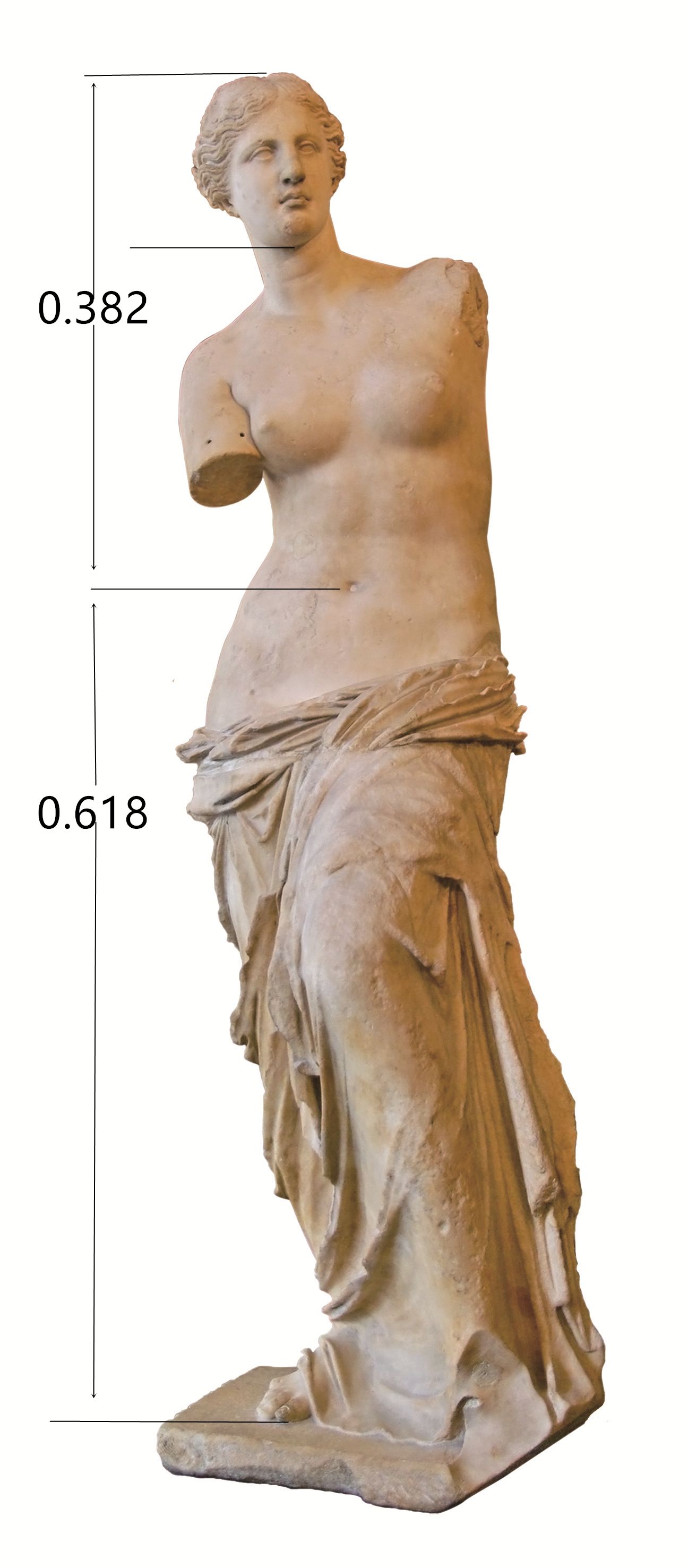《米洛斯的维纳斯》(断臂维纳斯)作者虽佚名,但身体上则呈现出黄金分割比(见下图),是希腊人对理想化躯体的投射。直到19世纪,人们仍拿维纳斯作为人们评判女性美的标准。