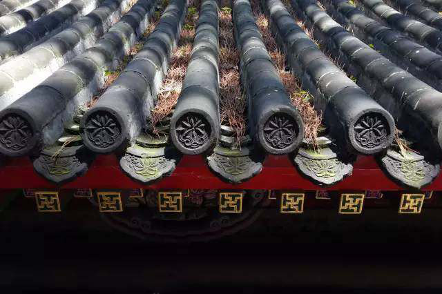 顺便说一下,同样在檐头筒瓦前端的遮挡物,近似三角形的叫滴水,主要起到排水的作用。