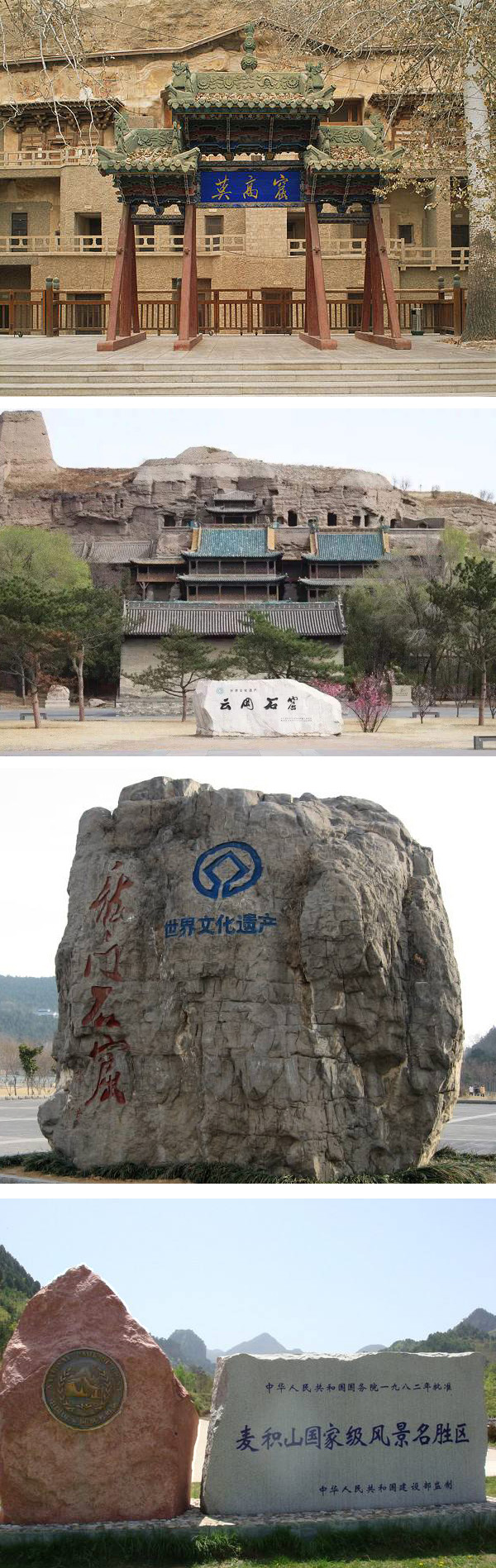 莫高窟(甘肃敦煌)、云冈石窟(山西大同)、龙门石窟(河南洛阳)、麦积山石窟(甘肃天水)。