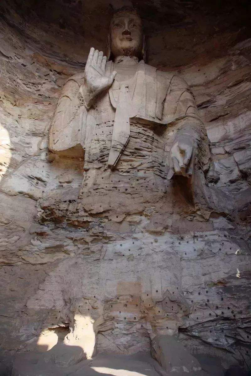 可昙曜五窟,也是整个云冈石窟中最为人所知、最具代表性的,还不是16窟的这个造像,而是20窟的释迦坐像。