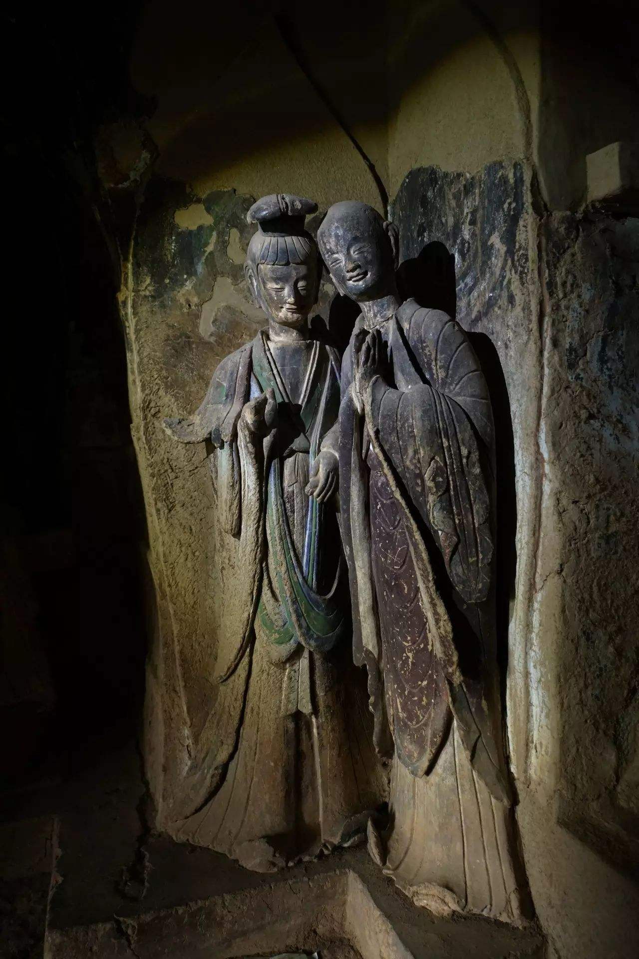 其中,在121窟的左右壁角,有两对塑像,比丘、比丘尼两两贴近,低声耳语,被称为"窃窃私语"组像。