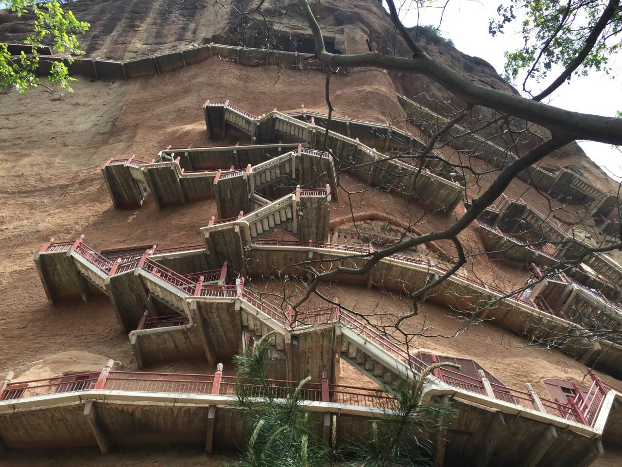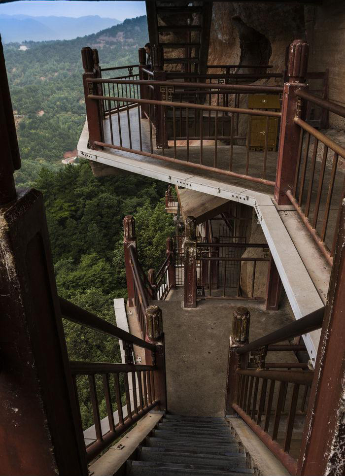 为了保护文物,麦积山没有像张家界一样加装电梯,还是采用了栈道之字形木梯的形式。