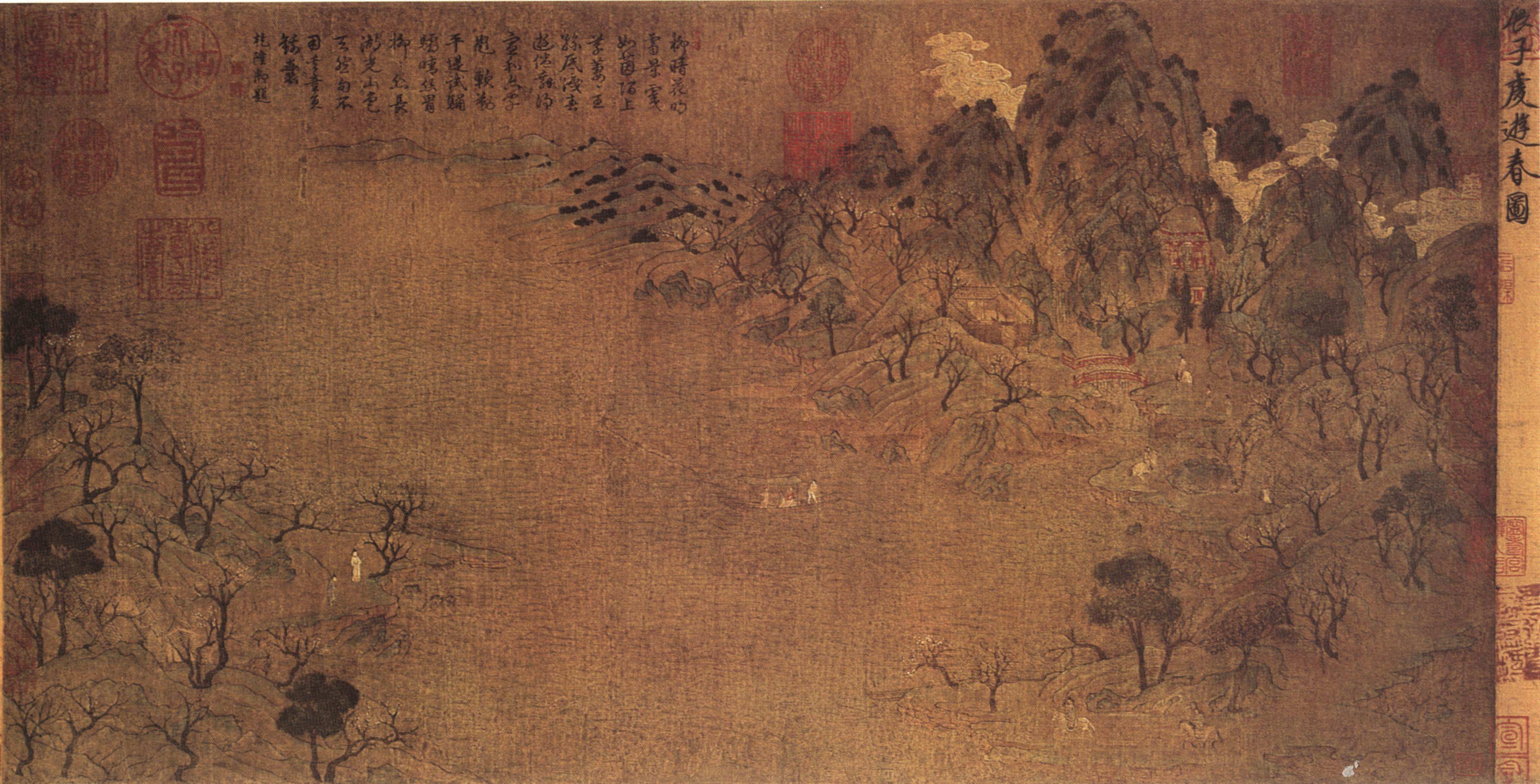 《游春图》采取俯瞰式的构图,在不大的画幅里描绘出了广阔的山水空间,表现出人们在壮丽的山川景物中纵情游乐的情景。