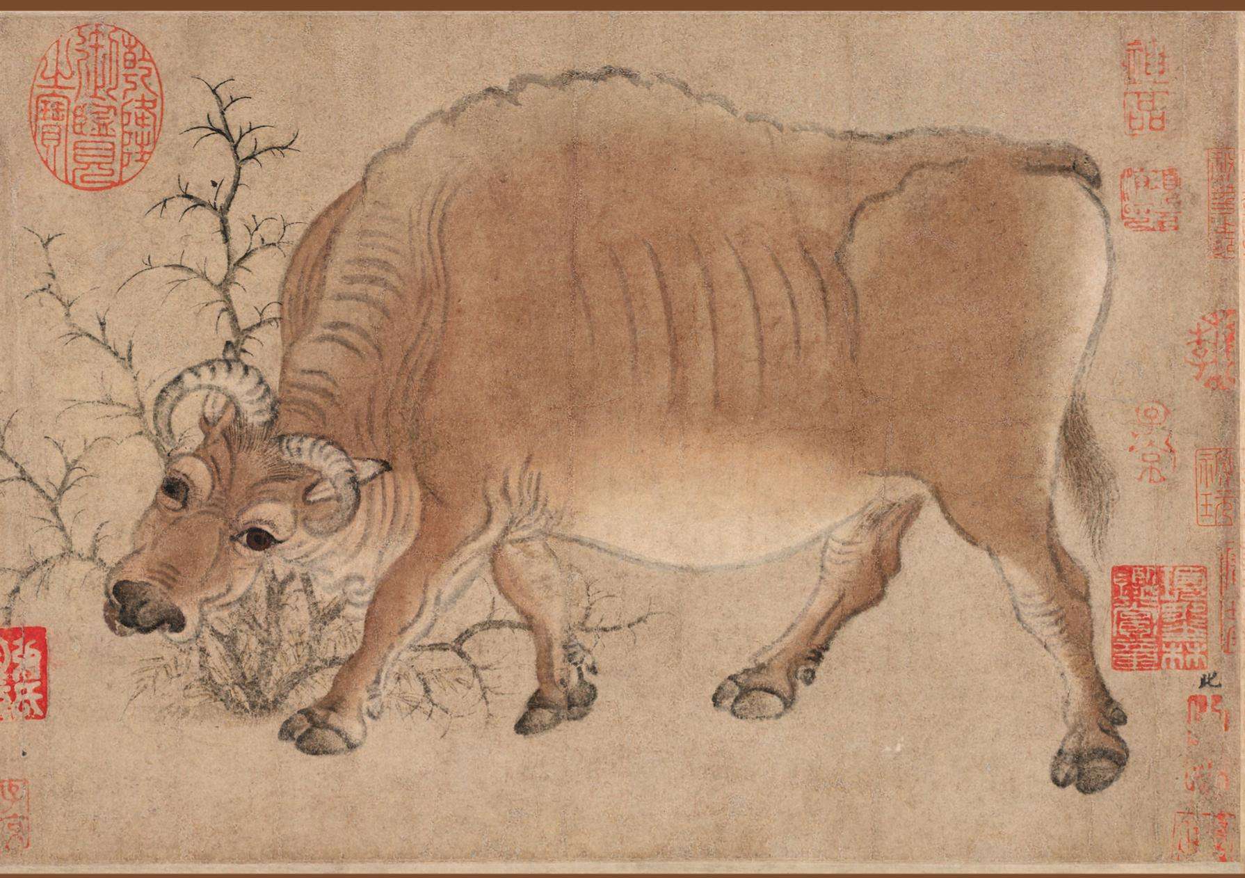 《五牛图》,纵20.8厘米,横139.8厘米,黄麻纸本设色——这点很重要,因为它是今天我们所能看到的最早的纸上绘画之一,一度被称为现存最古的纸本中国画。