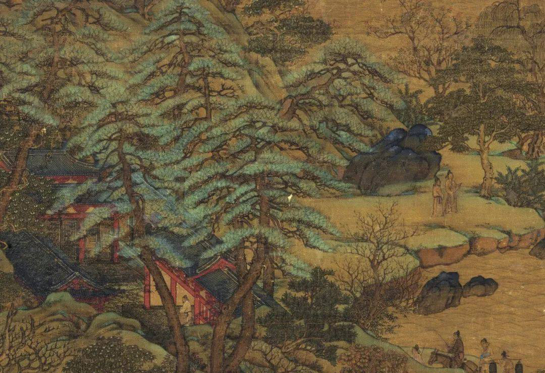 山石用了很浓艳的青绿色来涂染,在部分墨线转折处勾以金粉——这就是所谓的“青绿为质,金碧为纹”的金碧山水画法。