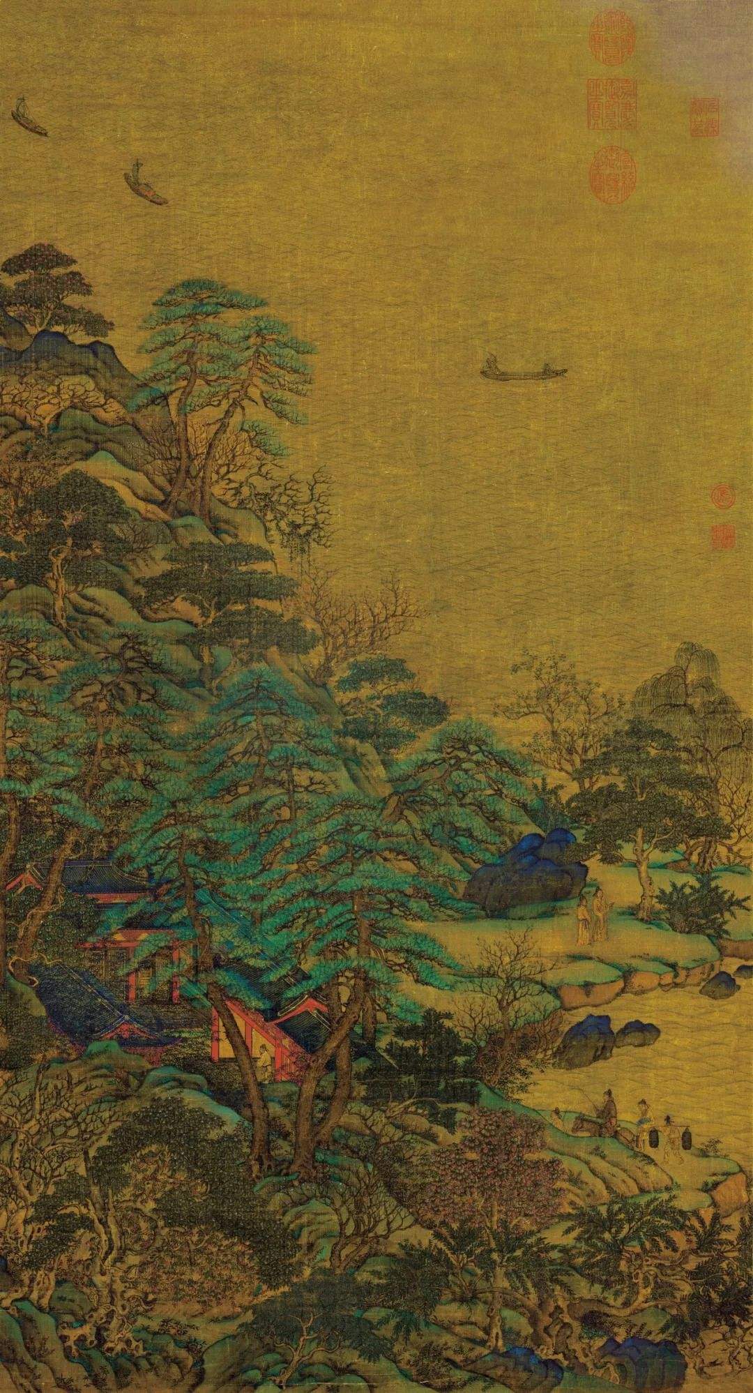 到了李思训这里就好多了,为了强调山的高大挺拔,特地把人物画得很小。这样,大自然的雄奇伟大也就显现出来了。