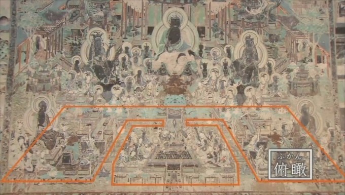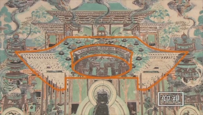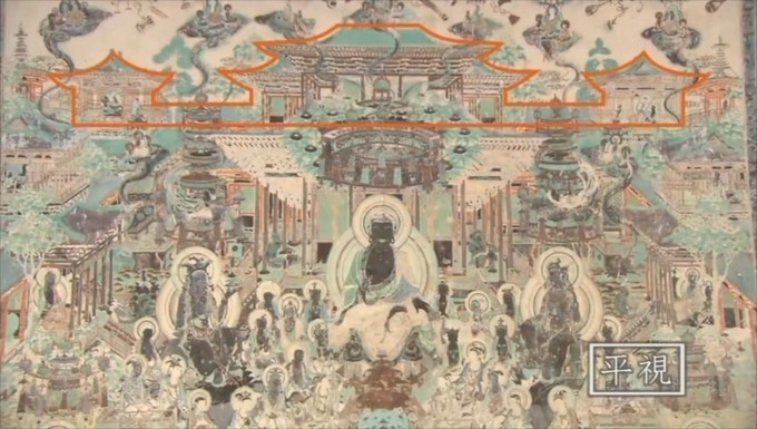 北壁壁画内容为《观无量寿经变》,其中建筑的布局和透视最为特别:中部大殿是建筑主体,画成仰视,显得高大;两侧配殿,画成俯视,利于表现其广阔;后部楼阁,则取平视,显得深远——这种画法被后人称为“三远法”。