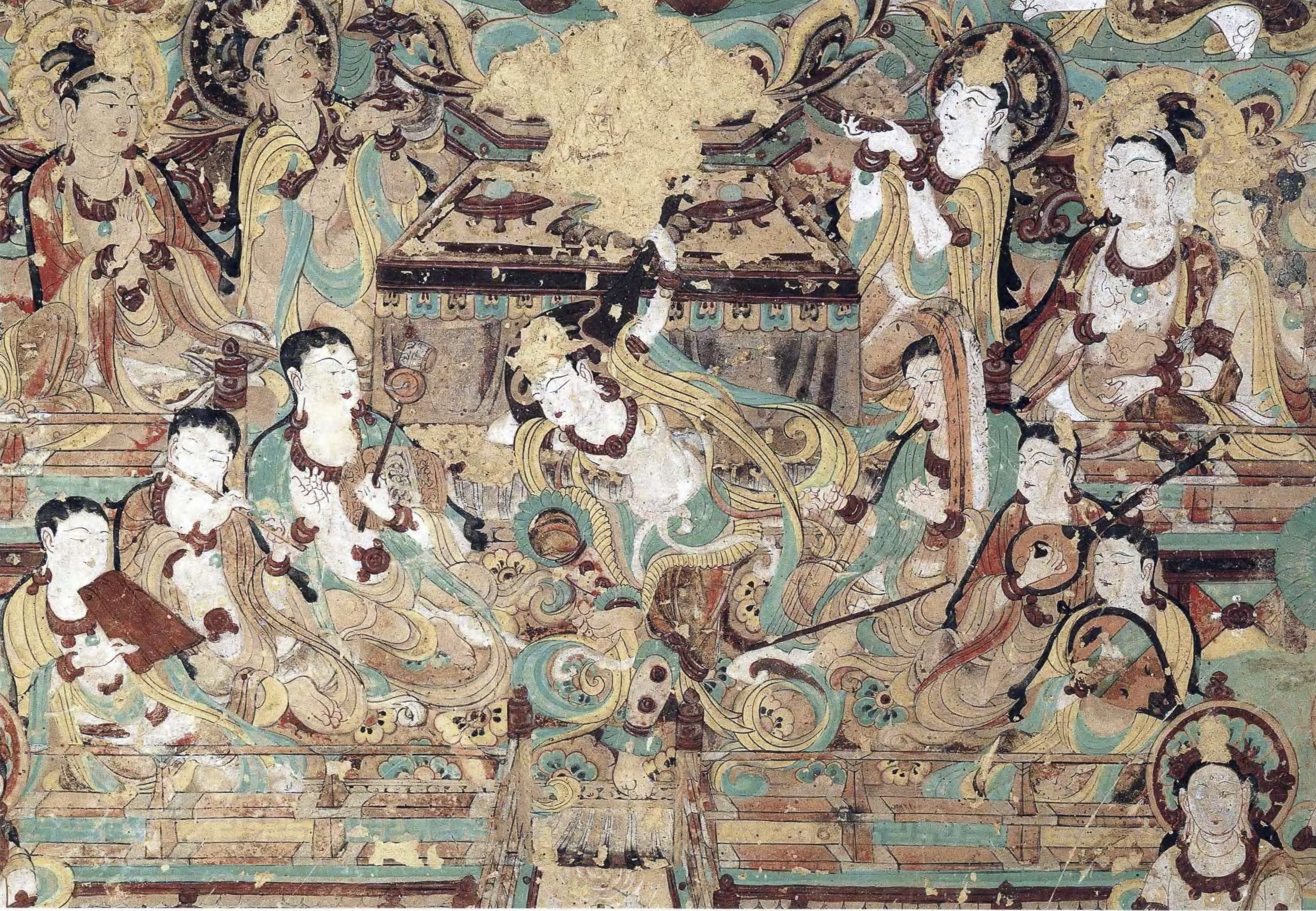 净土变相虽然是佛教题材,但它所取材的都是现实生活中的美好场景:楼台伎乐、水树花鸟、七宝莲池……描绘的是天花乱坠、歌舞升平,以此吸引人们信仰佛教,往生之时可以去尽情享受(嗯,这就是最早的房地产型广告啊)。