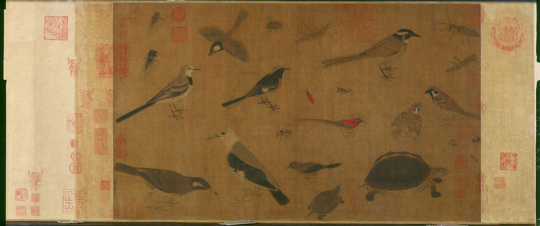 这幅《写生珍禽图》纵41.5厘米,横70.8厘米,一共描绘了24 只动物,其中禽鸟有麻雀、鸠、白头翁、大山雀等,昆虫有蚱蜢、天牛、蝉、金龟子、蝗虫、蜜蜂等,以及一大一小的两只龟。