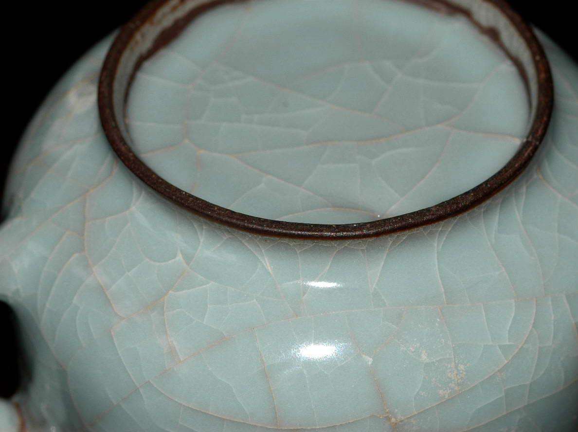 胎土含铁较多,手感沉重,呈褐色或紫色。釉色主要有月白、粉青、大绿三种,经常出现如蟹爪纹的自然开片,因其口沿及足部釉汁较薄露出胎色,所以称为“紫口铁足”。