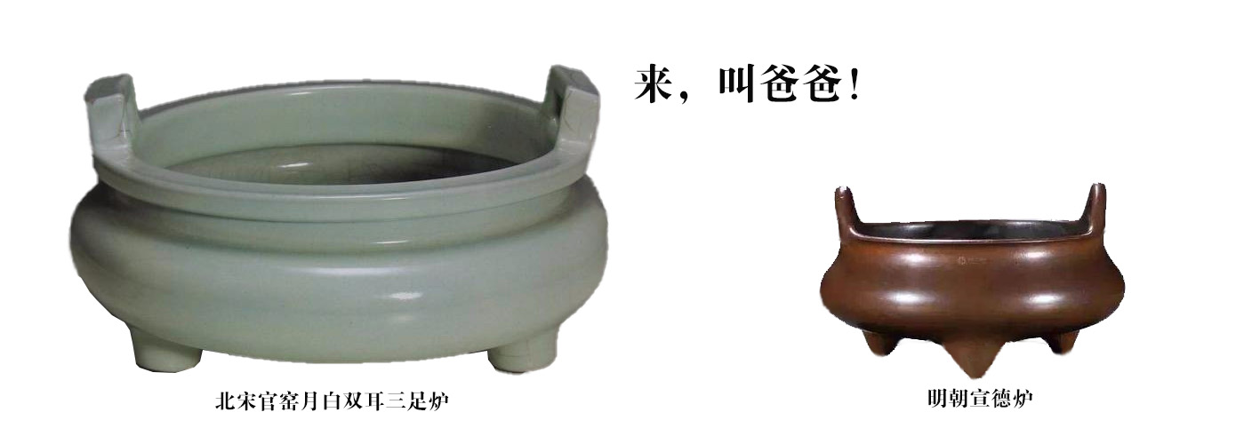 这种三足炉的形式,是宋人依据商周时期青铜器中鼎的造型设计出来的,主要用于陈设和熏香。明代曾根据这种造型,制作出了古玩圈里著名的宣德炉。