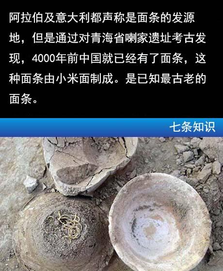 目前国内基本认为,早在4000年前,黄河先民就已经用小米面做出了世界上最早的面条。面条是中国人发明的,不是意大利人,也不是阿拉伯人。