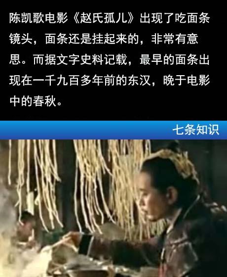《赵氏孤儿》所处的春秋时期是否有面条?也不排除有的可能,因为当时已经发现明的石磨,也有少量的小麦,具备了制作面条的条件。早期的面条有可能是刀削面似的面片片,最初被称为“饼”。