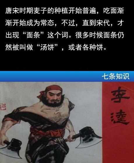 宋代的面条种类已经非常多,《水浒传》中,戴宗和李逵和在素面店吃过壮面。有人认为,壮面就是大碗不加肉的粗面条,特别是非常热。