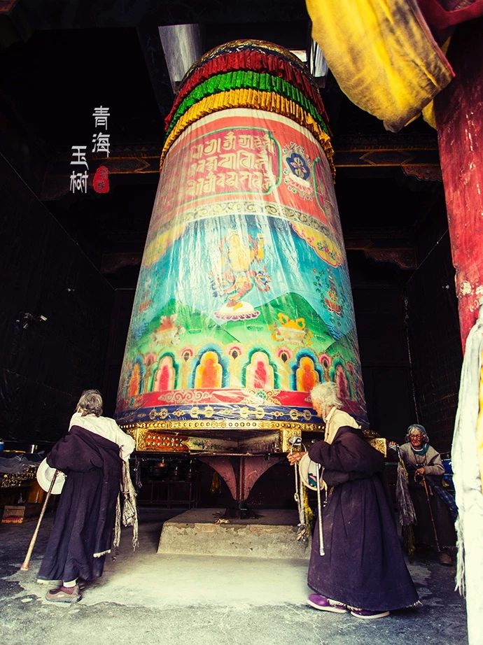 嘛呢堆的北面有一座寺庙。庙里有一个巨大的转经筒,转动一次经筒,就等于将经书诵读了一遍。