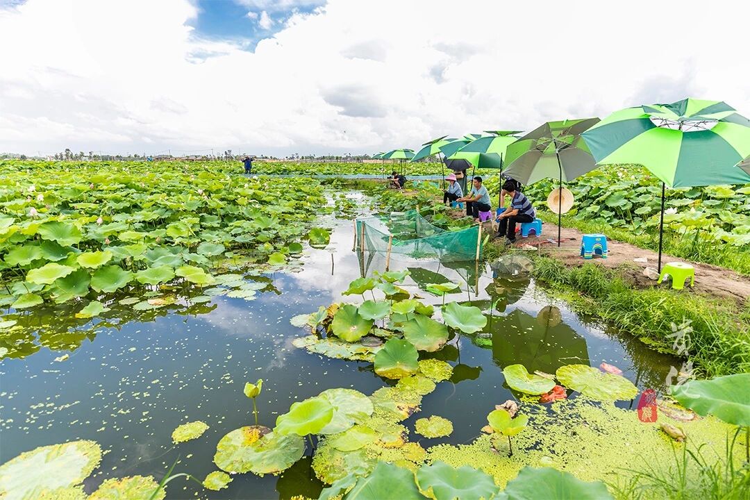 还有一些当地人顶着烈日在荷塘里钓小龙虾,想到小龙虾的鲜嫩滋味,我也心痒痒地想参与其中。