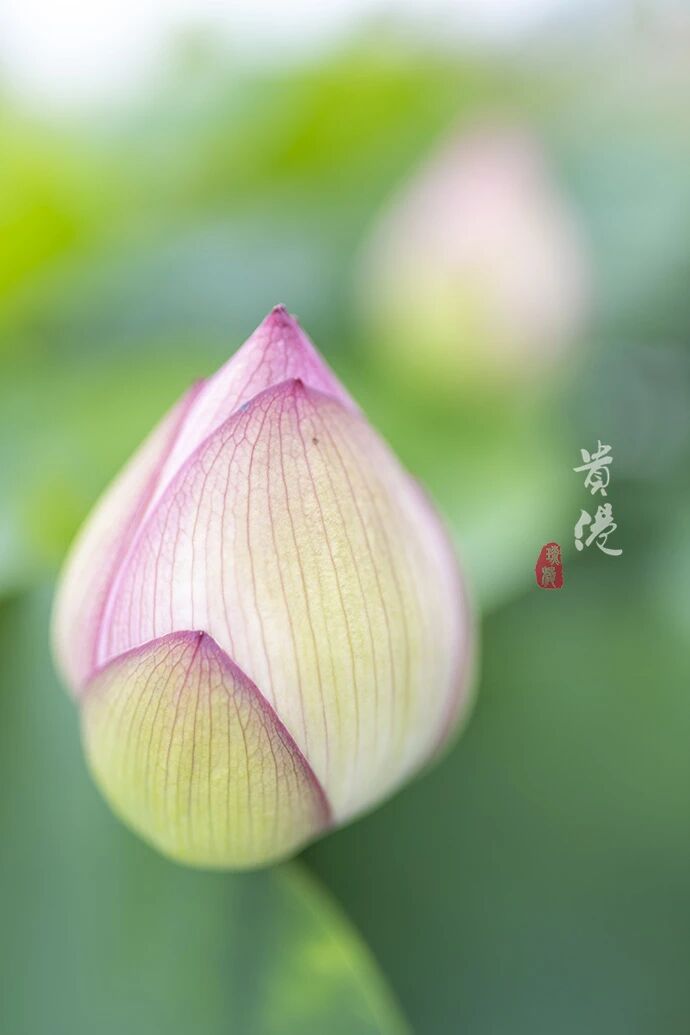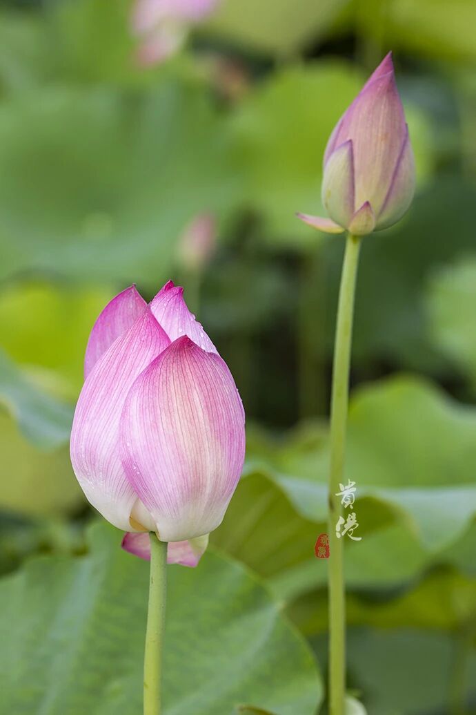 一茎产生两花,花各有蒂,蒂在花茎上连在一起。这株并蒂莲含苞待放,粉色的花苞饱满得像马上就要破裂而出。