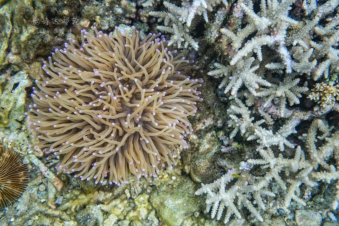 回程时路过一个无名小岛,还没潜够的我又下去浮潜了一次。这片海里的珊瑚和海葵好像更精致小巧一些,色彩也很丰富。