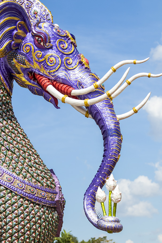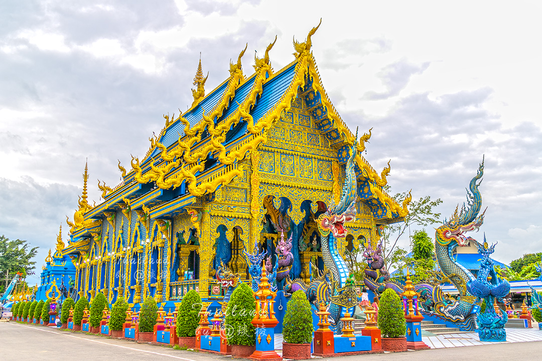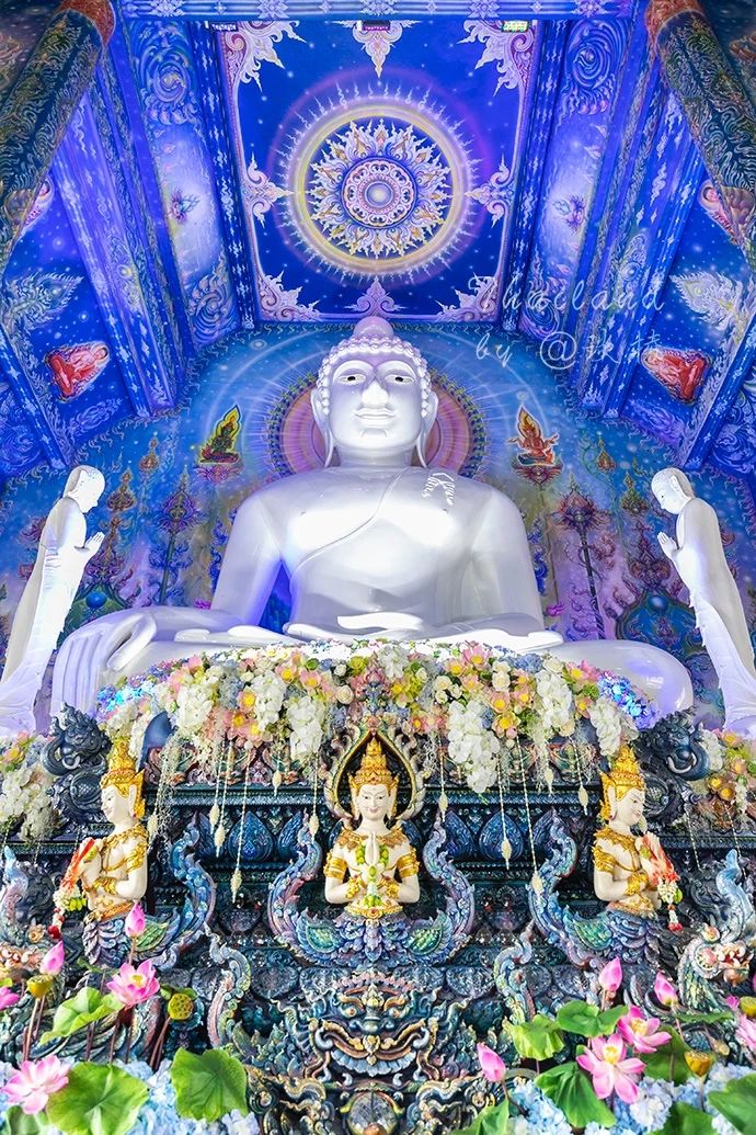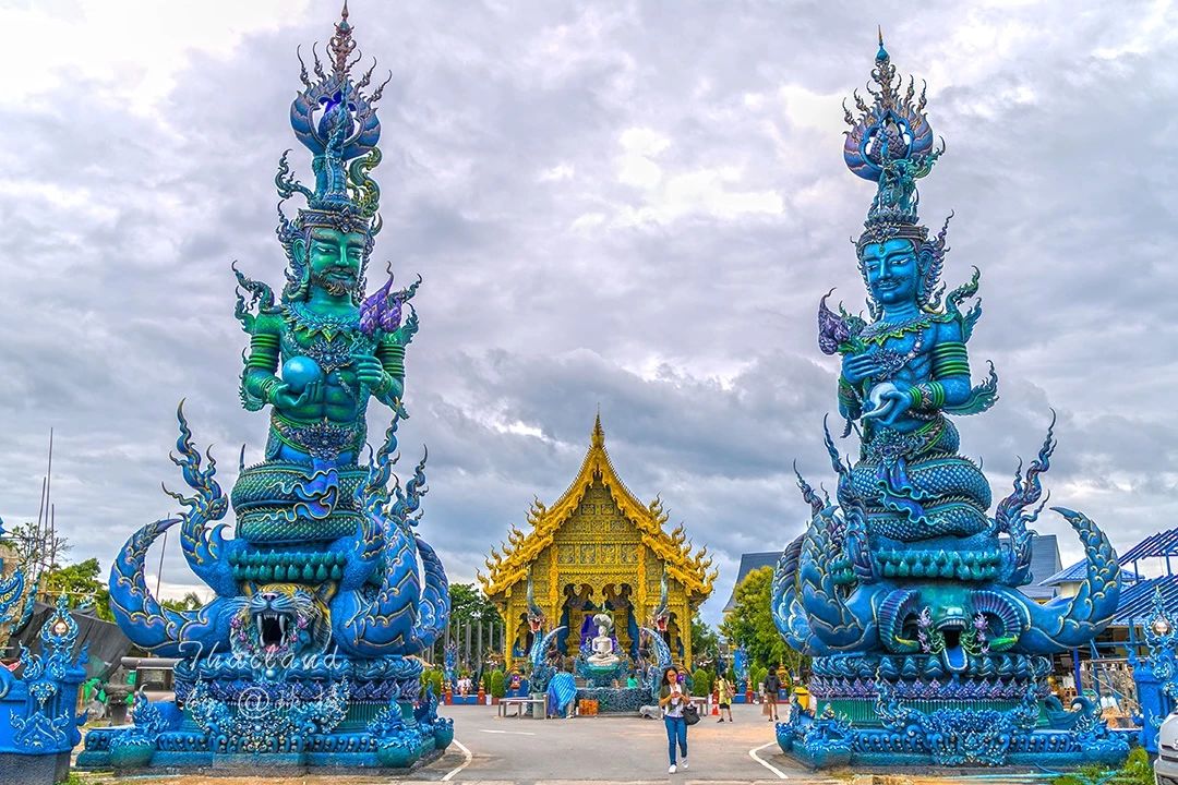 若要我说,清迈的蓝庙其实蓝色元素不算多,清莱的蓝庙 Wat Rong Suea Ten 才是名副其实的蓝庙。虽然比起清迈蓝庙小巧许多,但是更加精致,蓝得更加纯粹,神圣中又带了点魔幻。