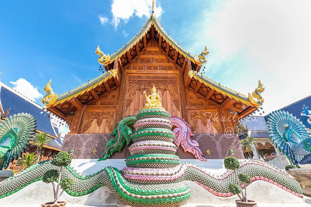 之所以这里会被叫做蓝庙,是因为寺内的建筑集合了兰纳与缅甸两种风格。最鲜明的特点之一便是屋顶以一种令人陶醉的湛蓝色为基调,除了这炫目的蓝,蓝庙建筑群还随处可见绿色、粉色等色彩鲜艳的雕塑。