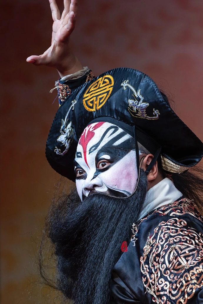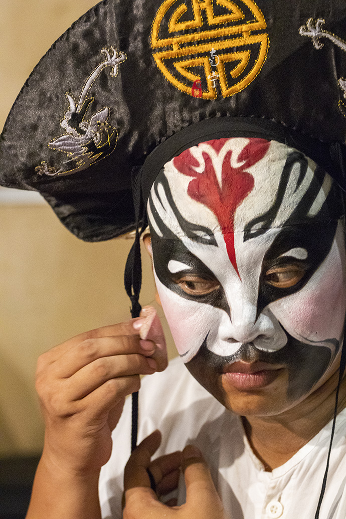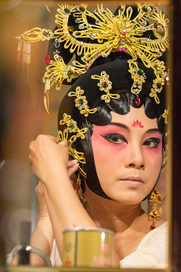 邕剧的行当有生、旦、净、丑四大类,以小武、武生、散发旦、花脸行当为主。因为对他们的妆容很感兴趣,表演开始前我还特意去了后台,拍他们的化妆花絮。