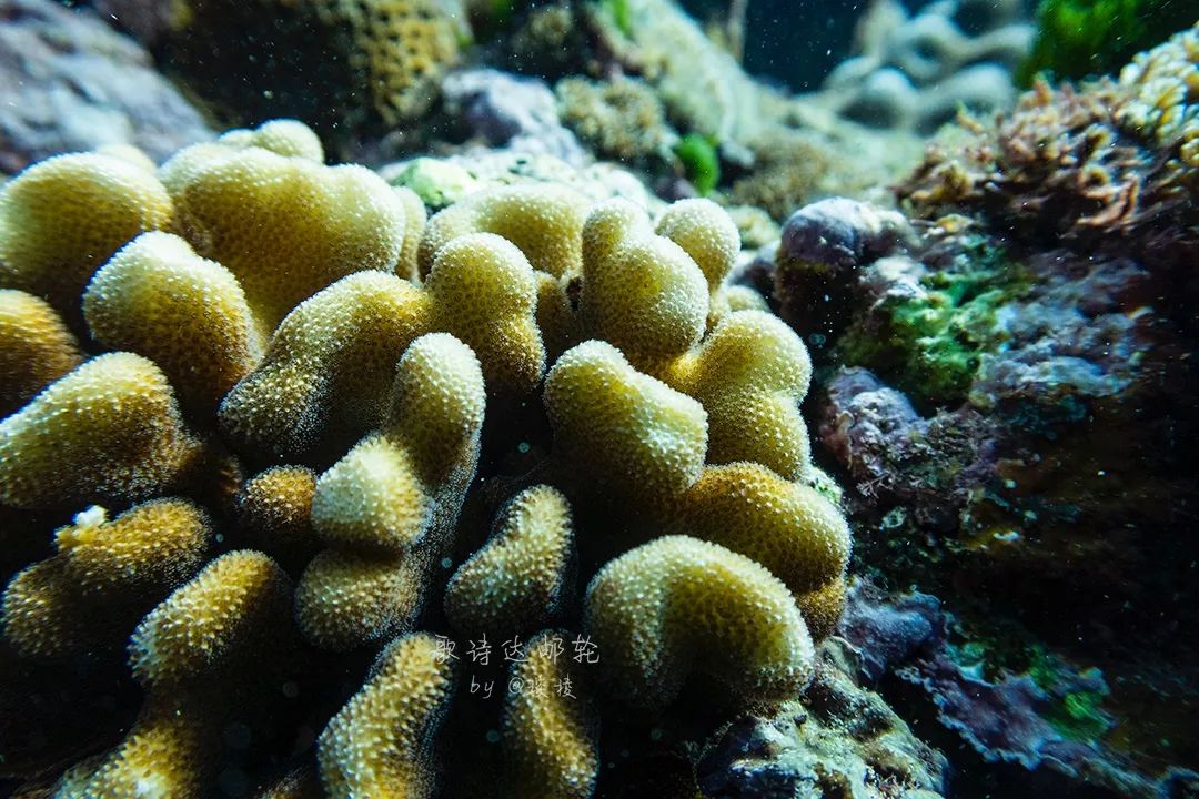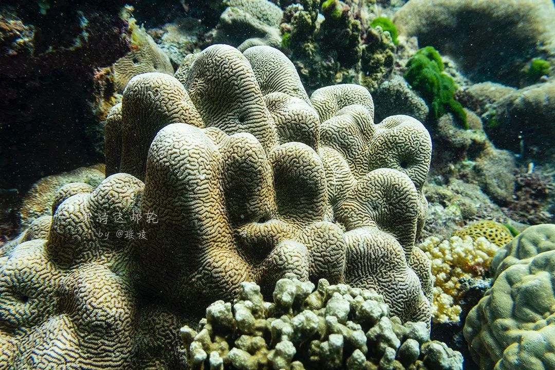 海面上的光透过澄澈的海水洒在海底的生物上,脑珊瑚上的纹路清晰可见,真的就像是脑子一般。