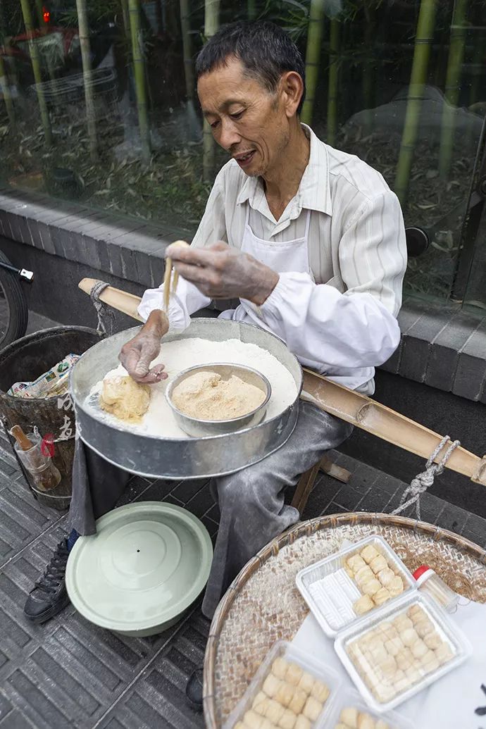 不得不提糖油果子。这是每个正宗的成都人幼时的味道。旁边一口大油锅滋滋啦啦,这边出锅的糖油果子外面一层撒了白芝麻的脆糖皮真心甜。放冷了吃,更脆更糯,简直要黏掉牙。