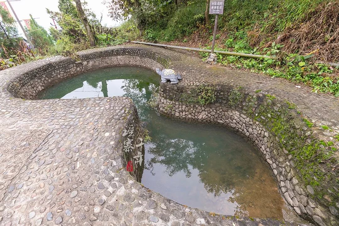 庙外有个葫芦型的水池,据说是因为以前发洪水,盘古王坐着葫芦逃生。所以瑶族人建了这样一个水池以纪念,并祈求风调雨顺。