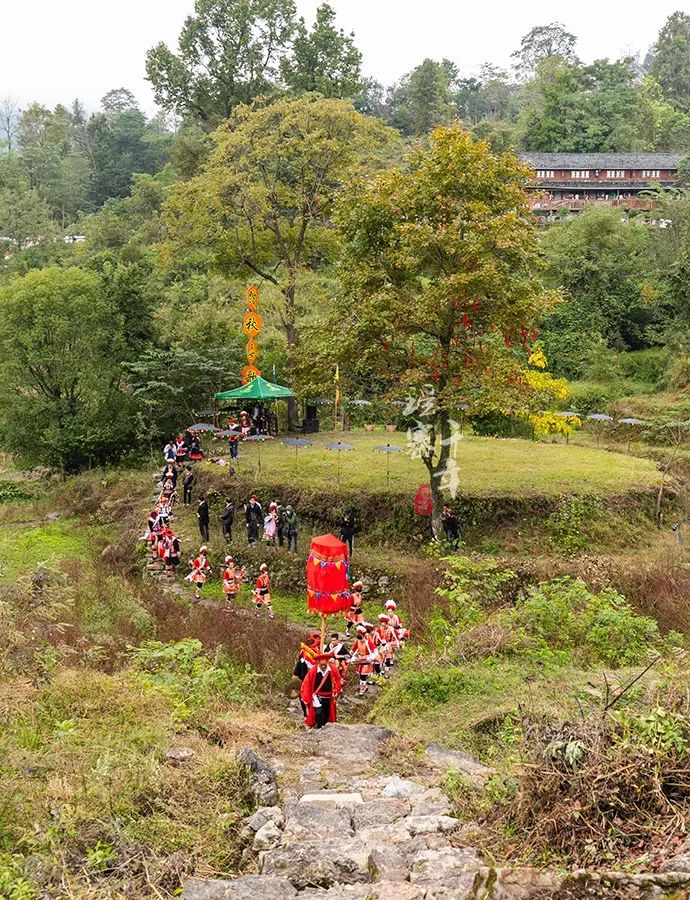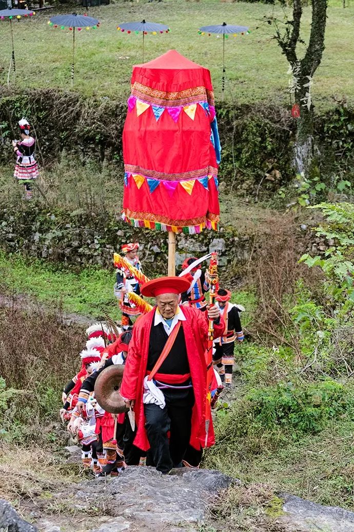 长长的队伍逶迤铺陈在瑶寨的土地上,红色的服饰和绿色的背景形成鲜明的对比,给每一个有幸看到这个活动的客人都留下了深刻的印象。