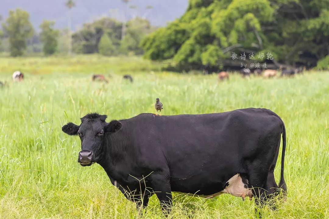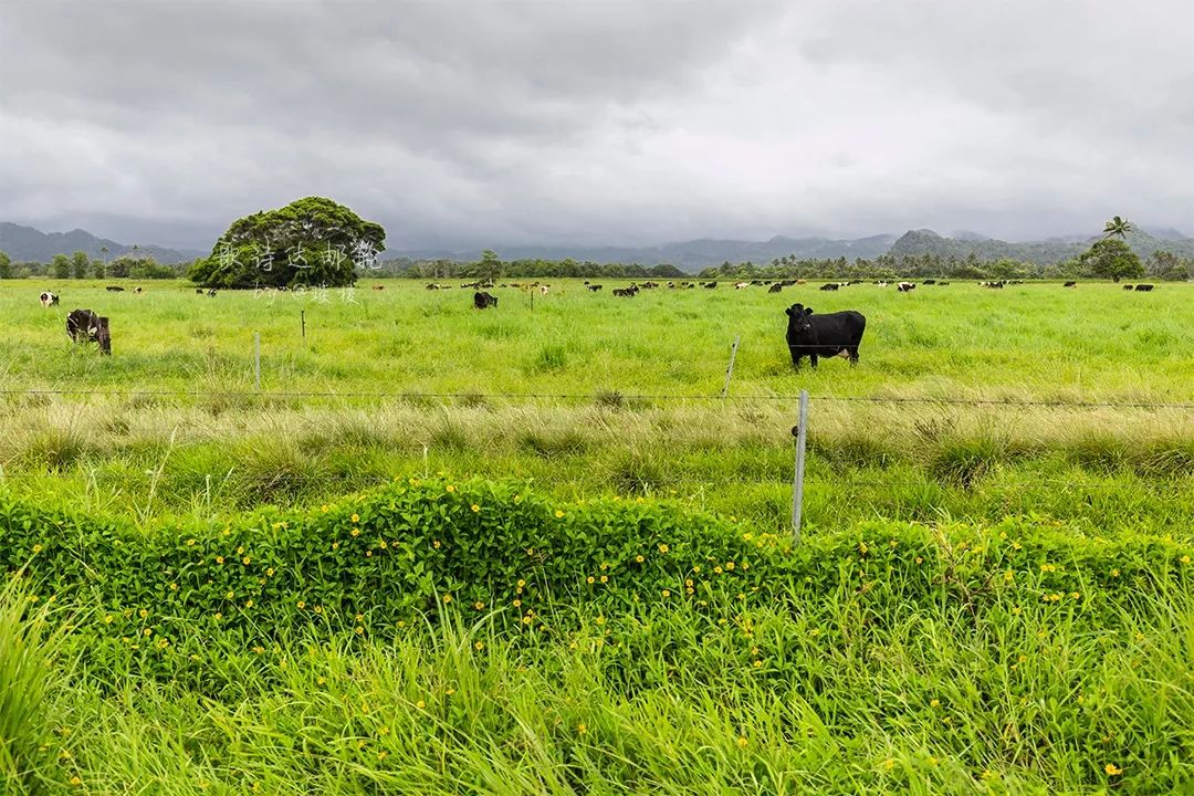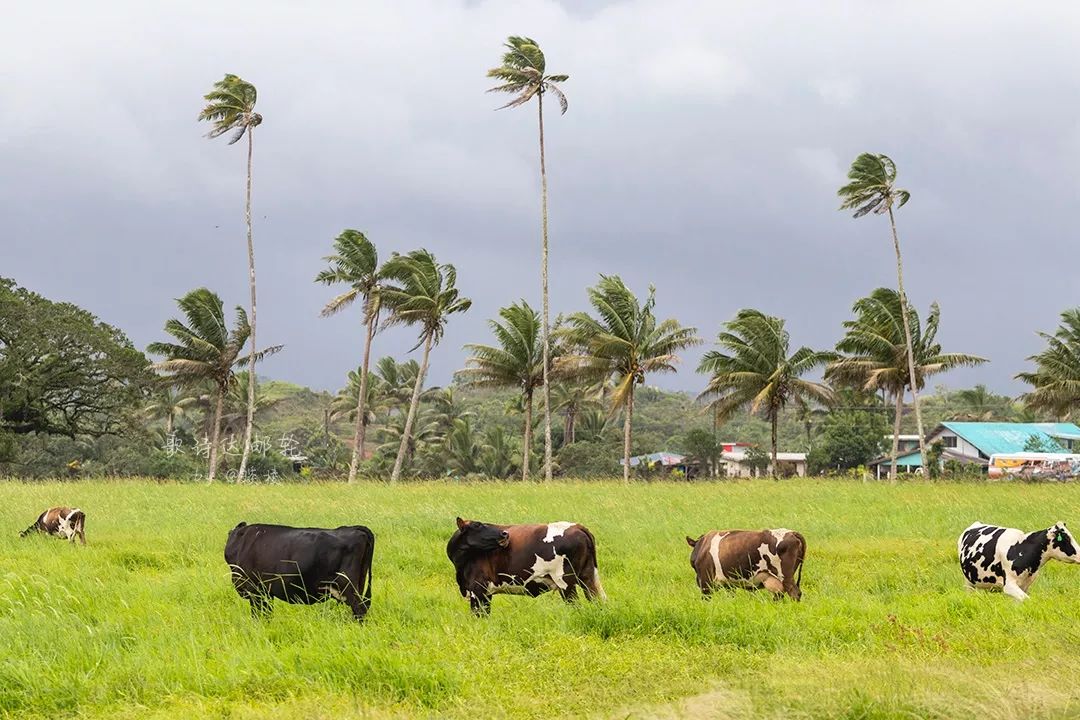 地上生长着大片大片青绿的草,悠闲的奶牛三三两两散布其间。椰子树已然成为背景,高高的直耸入云。一阵风来,瘦瘦的椰子树都被吹得呼呼作响,但奶牛们却丝毫不受影响,应该是已经习惯了这样的天气。