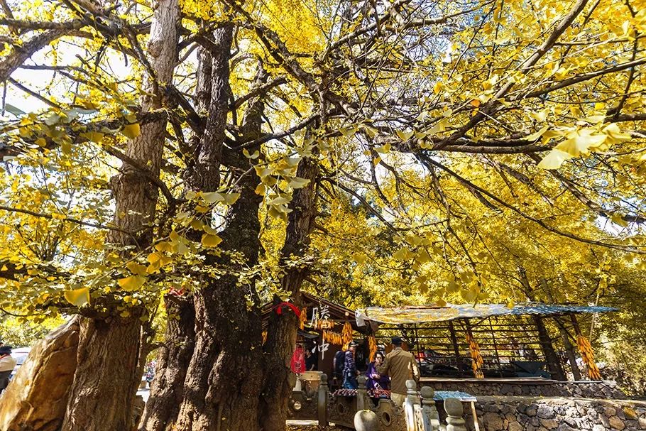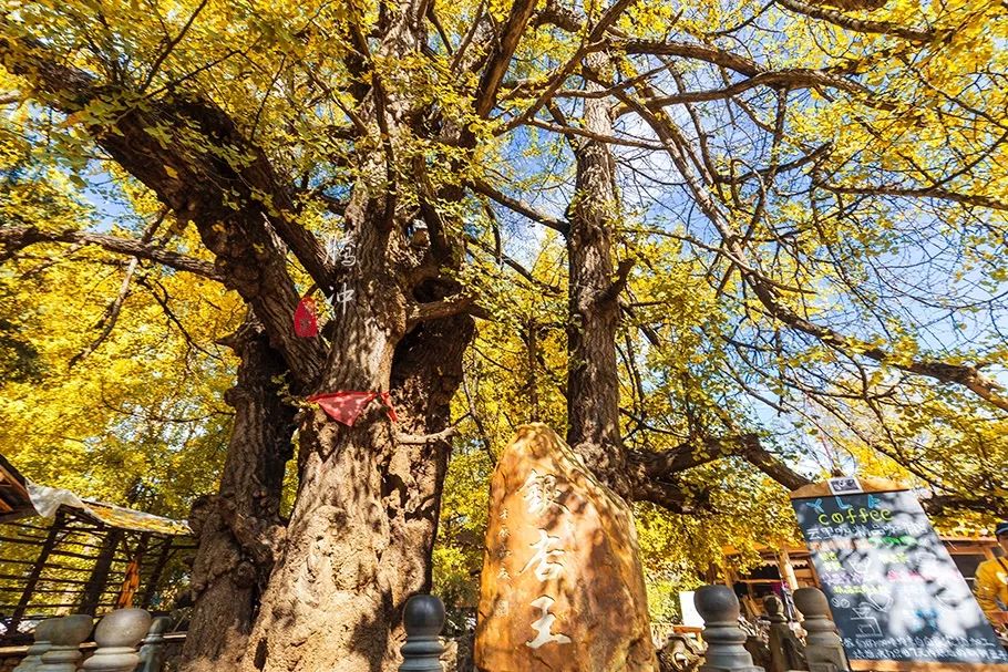 最古老的银杏王树龄在1300年以上。当你站在银杏王的树下,抬头仰望,天空被树叶枝丫分割的一块一块,金色和蓝色交替间隔,成为一幅静态的油画。若是到了夏天,满树翠绿,又该是另一番风情了吧。