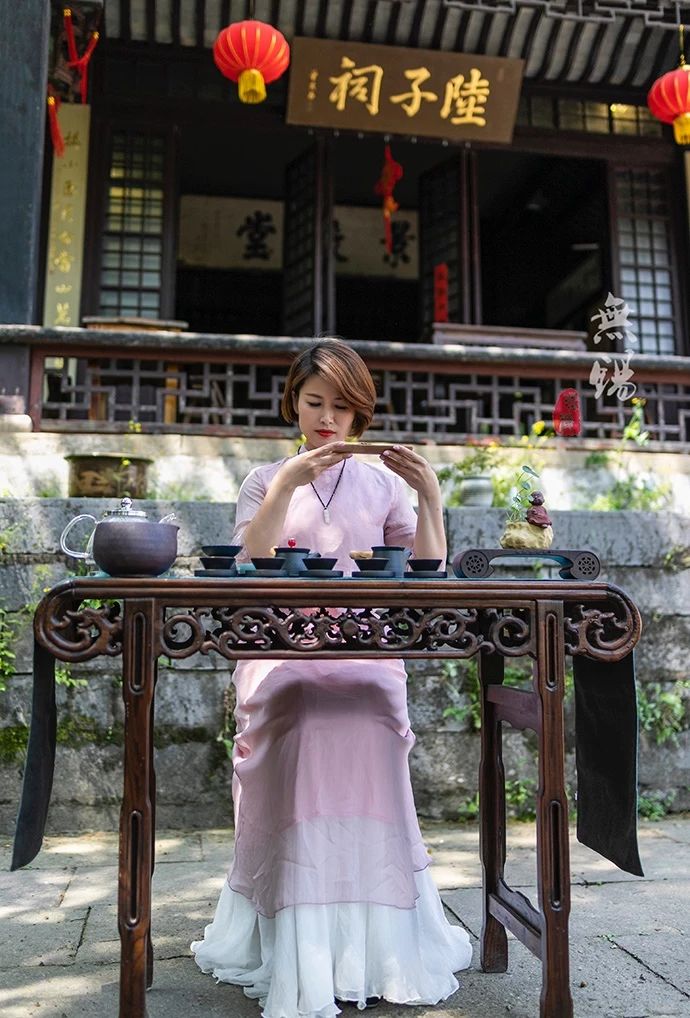 在古朴的陆子祠前,看专业的茶艺师全神贯注的斟茶注水,手指翻飞间,喝茶也成为了一场舞蹈。景美,人更美。