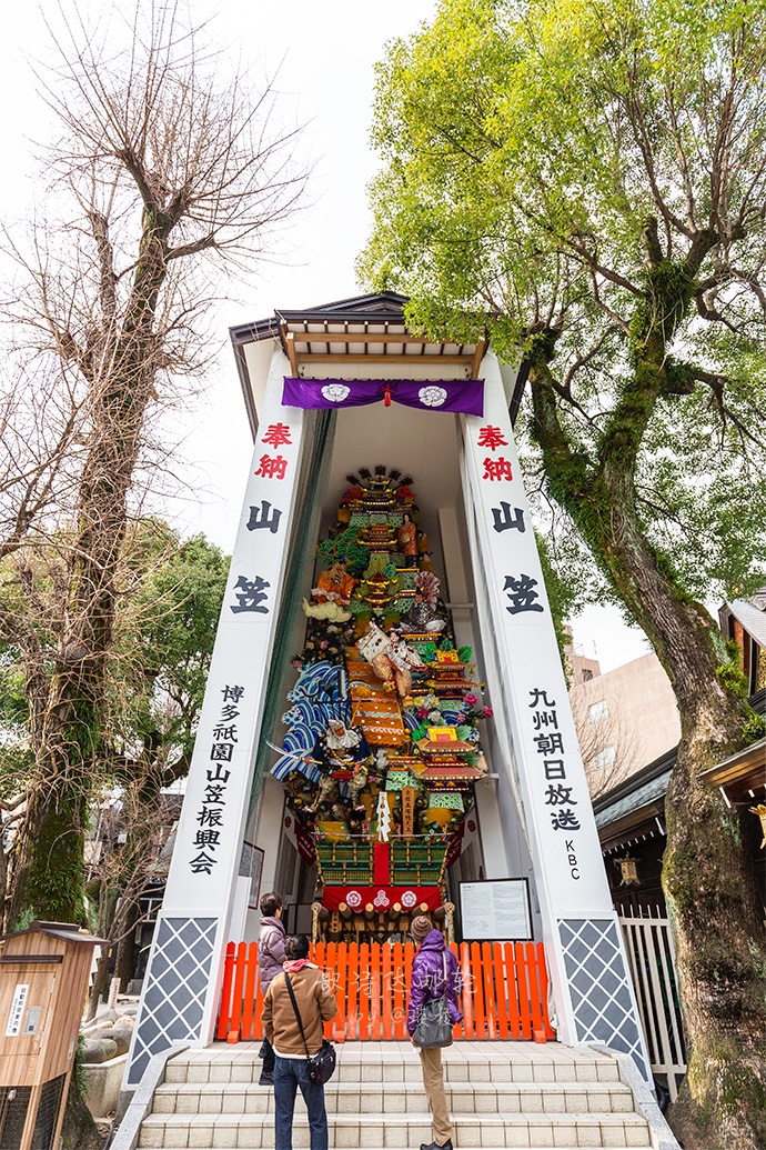 “博多祇园山笠祭”里的博多祇园山笠,被誉为博多的总镇守,已经有760多年历史了。即使不是祭典,也是常驻神社内。一眼看上去,十分高大精美。博多人相信博多山笠会一直守护他们。