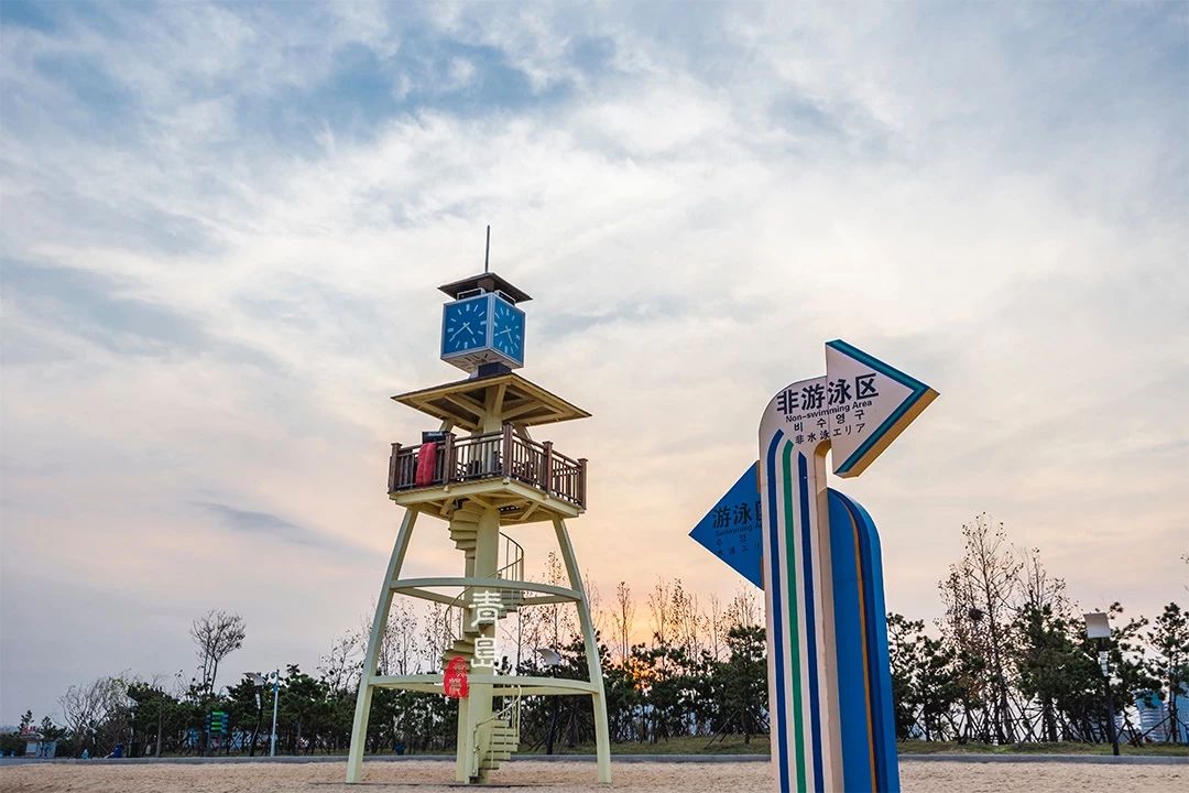 若你忍不住,想下去痛痛快快的游个泳,沙滩上的瞭望塔旁边用中韩日三国文字标注了游泳区和非游泳区。可千万要遵守规定啊。