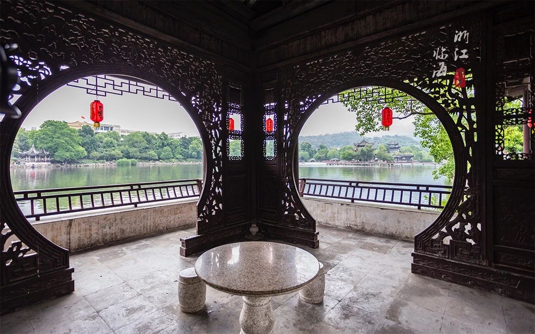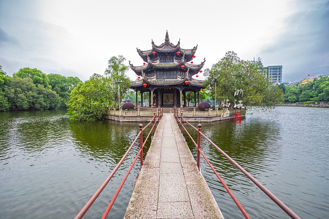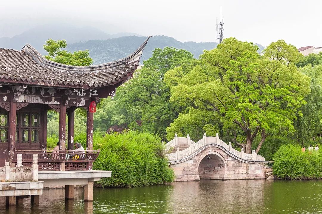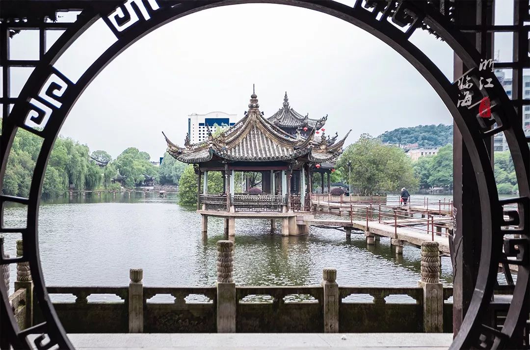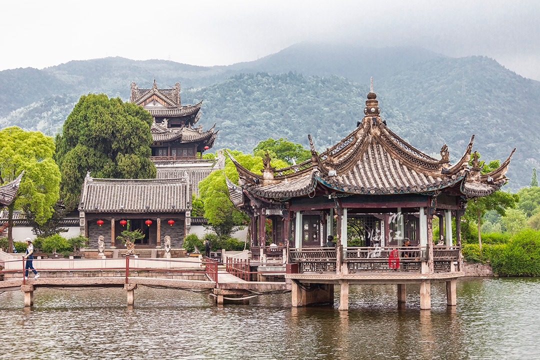 远远看上去,背景的群山连绵起伏,前面的建筑古意十足,还有一汪清清的湖。这个感觉是不是很像江南的古典园林?