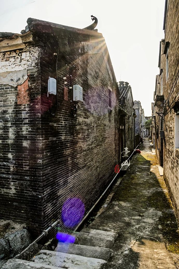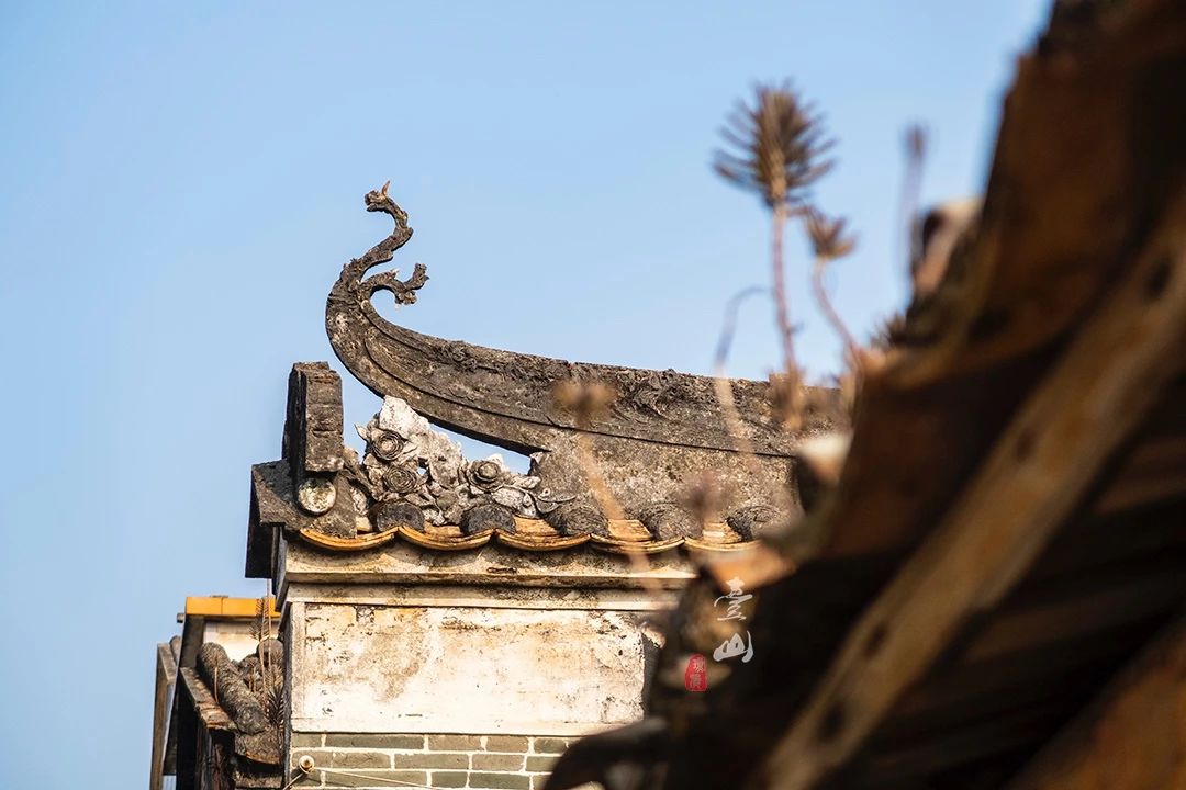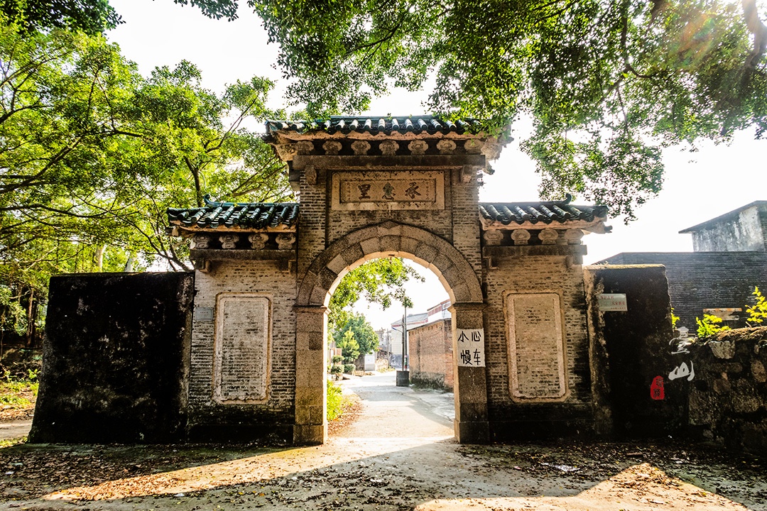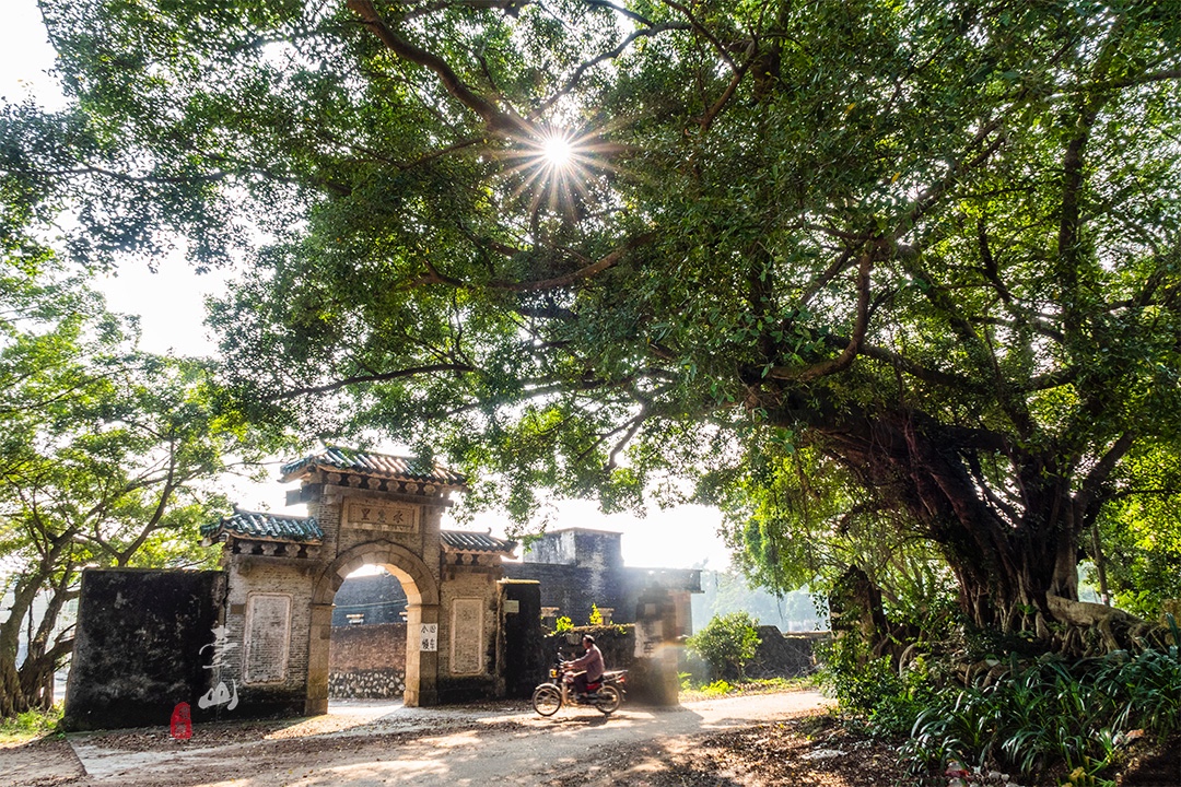 牌坊左侧是残存的清代护村墙,一颗参天大榕树的虬根缠绕其上。不知这榕树长了多少年,才有今天这般恣意张狂的样子。枝丫伸张,拢下一片阴影。凑近,好像还能闻到空气中的草木香气。
