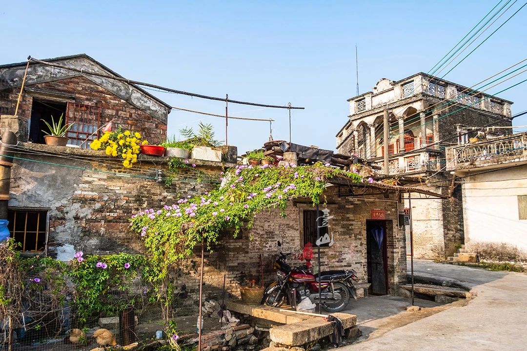 有些民居已经很斑驳,村民们便想到用植物布置来遮挡。紫色、黄色的花朵给古旧的房子增添了几分生机。