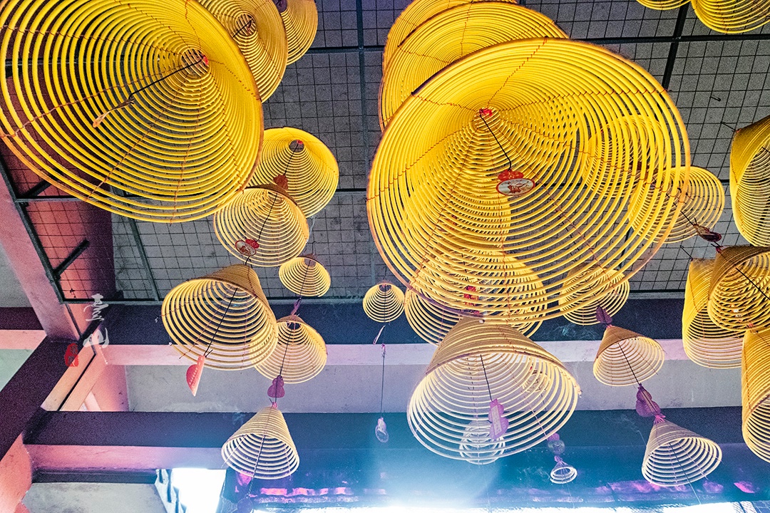 庙中供着大型的盘香,一圈圈绕起,就像一把把撑开的伞。
