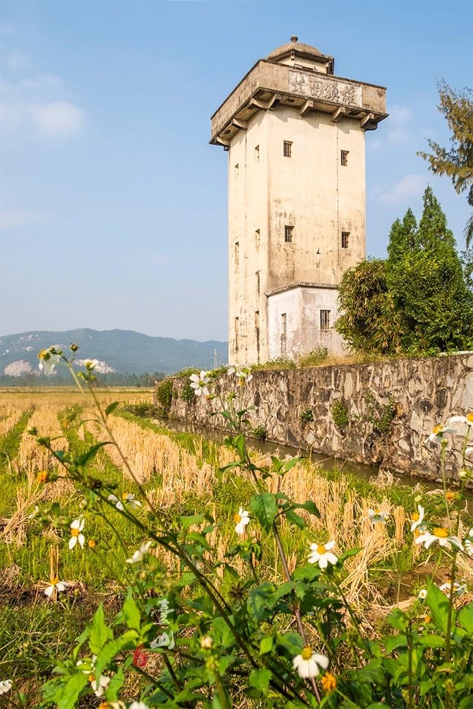 村中有一座名为“雄镇西北”的钢筋水泥结构碉楼十分显眼,与周围的农田、河水形成了鲜明的对比。村中老人说,从前贼匪肆虐,浮石村曾遭劫掠,因此村中才建了城垣、碉楼。