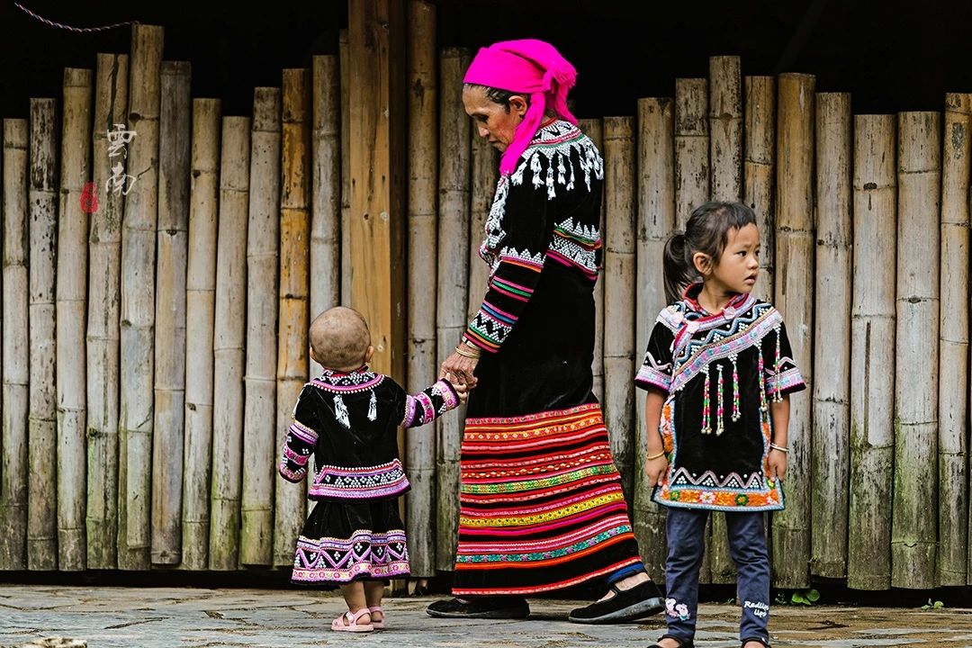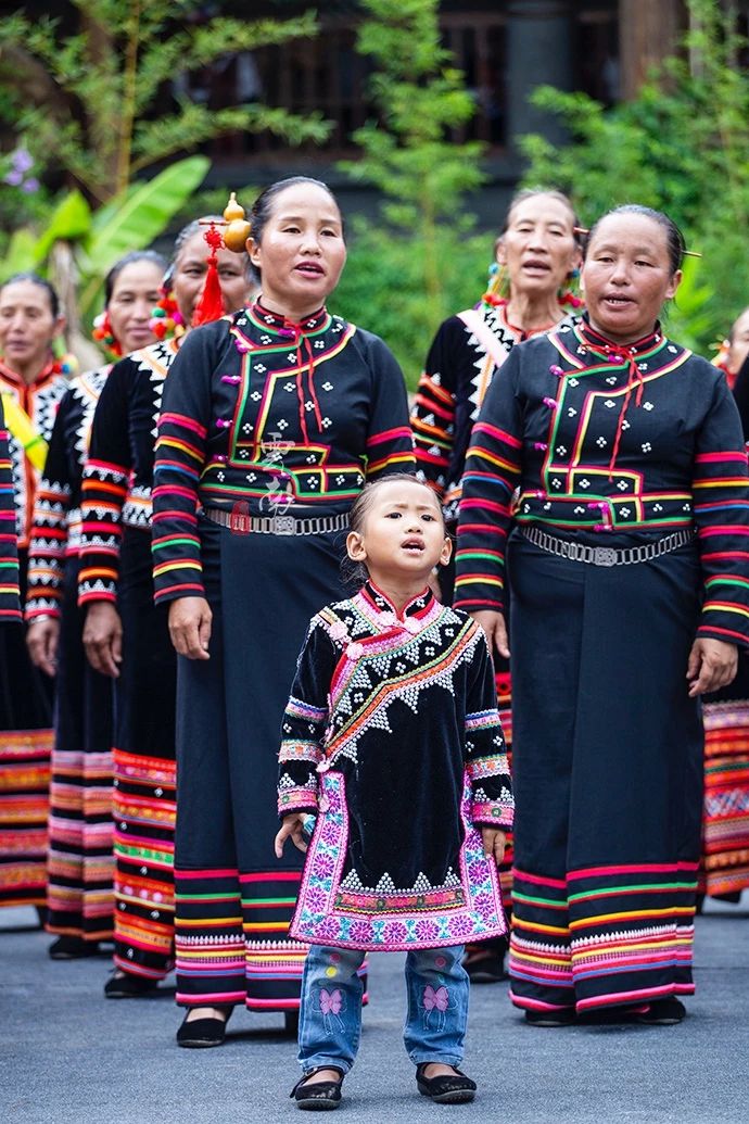 孩子们真是太可爱了。他们身上的衣服比大人的小了一号,更加浓缩了拉祜族服饰的特点。拉祜族以黑为美,服装大都以黑布衬底,又用彩线缀上各种花边,最后嵌上洁白的银泡,整个色彩既深沉而又活泼俏皮,让人移不开眼。斜挎着的包包上,彩穗随着舞蹈动作上下飞舞,在空中划出一道道美丽的弧线。