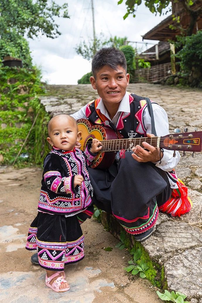 村中随处可见到弹奏吉他的村民。一位看起来是爸爸的村民,在用葫芦形的吉他弹奏给孩子听,难怪老达保的人都会弹吉他了。