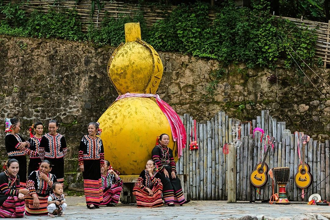你可能会好奇,他们很多的衣服上会绣有葫芦的图案,村子里还有硕大的葫芦造型的雕塑。这是因为拉祜族口口相传的史诗《牡帕密帕》记载了拉祜族祖先诞生于葫芦之中。因此他们对葫芦非常的尊崇。