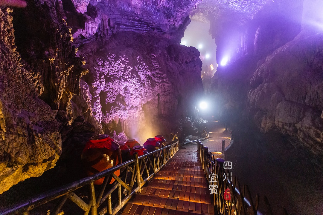 因为洞内缺乏足够的自然光照,于是人们就用不同颜色的灯光照射,溶洞本身的嶙峋岩石在灯光衬托下,光芒闪烁,宛如仙境一般。四亿五千万年形成的喀斯特地貌,让人叹为观止。
